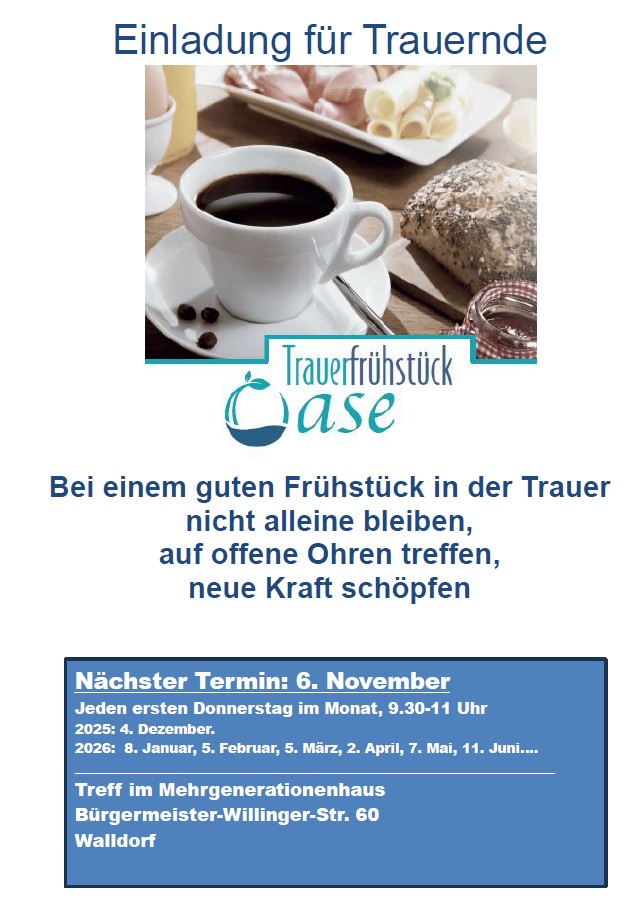 Herzlich laden wir alle Trauernden zum gemeinsamen Frühstück mit Austausch unter Begleitung von erfahrenen Trauerbegleitern ein. Bei einem stärkenden Frühstück in geschützter Umgebung wird es möglich, der Trauer Raum zu geben. Hier können Sie erzählen, was gerade belastet, hier dürfen Sie alles fragen, was beschäftigt und hier können Sie auch einfach nur zuhören, wenn das gerade guttut.