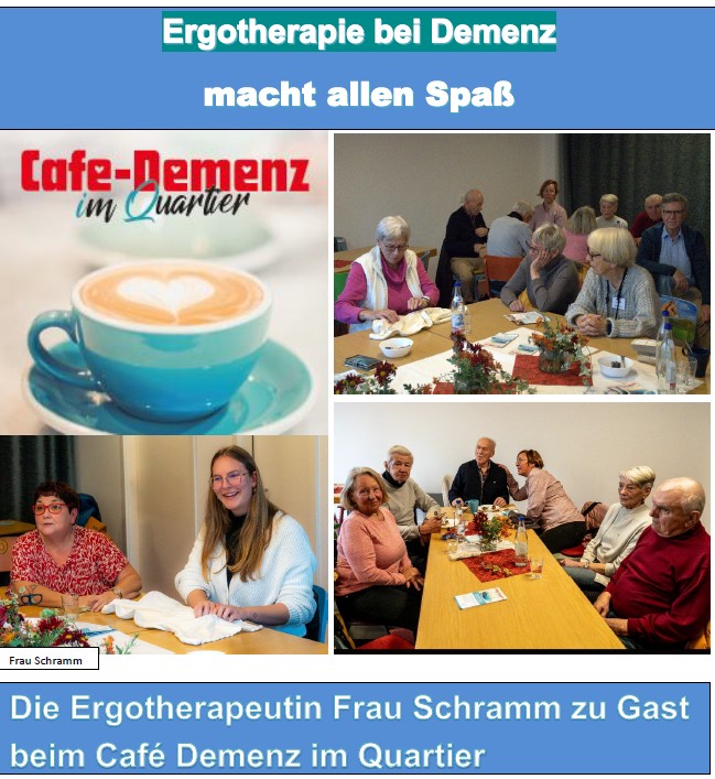 Beim Café Demenz im Quartier hatten wir ein ganz besonderes Programm: Die Ergotherapeutin Frau Schramm war zu Gast bei uns, um Angehörige und betroffene Menschen mit Demenz in die Welt der vielfältigen Unterstützungsmöglichkeiten durch Ergotherapie mitzunehmen. Durch das große Interesse am Thema war das Café voll besetzt. Als Frau Schramm begann, ihr Thema vorzustellen und die Fragen zu beantworten, waren alle voll bei der Sache. Wertvolle Hinweise für zu Hause zeigten Angehörigen Möglichkeiten zur Erleichterung des Alltags auf. Richtig lebhaft wurde es bei den praktischen Übungen und Spielen, die Angehörige und Betroffene gleichermaßen mitmachten. Es war faszinierend zu sehen, dass alle Spaß miteinander hatten – es gab keinen Unterschied mehr zwischen Betroffenen und Angehörigen. Die Anregungen können nun auch zu Hause für Freude und zur Entspannung im Miteinander beitragen. Alle waren sich einig – Ergotherapie ist eine Therapie, die Spaß macht! Wir freuen uns über das Versprechen von Frau Schramm wieder einmal zu uns zu kommen – herzlichen Dank!