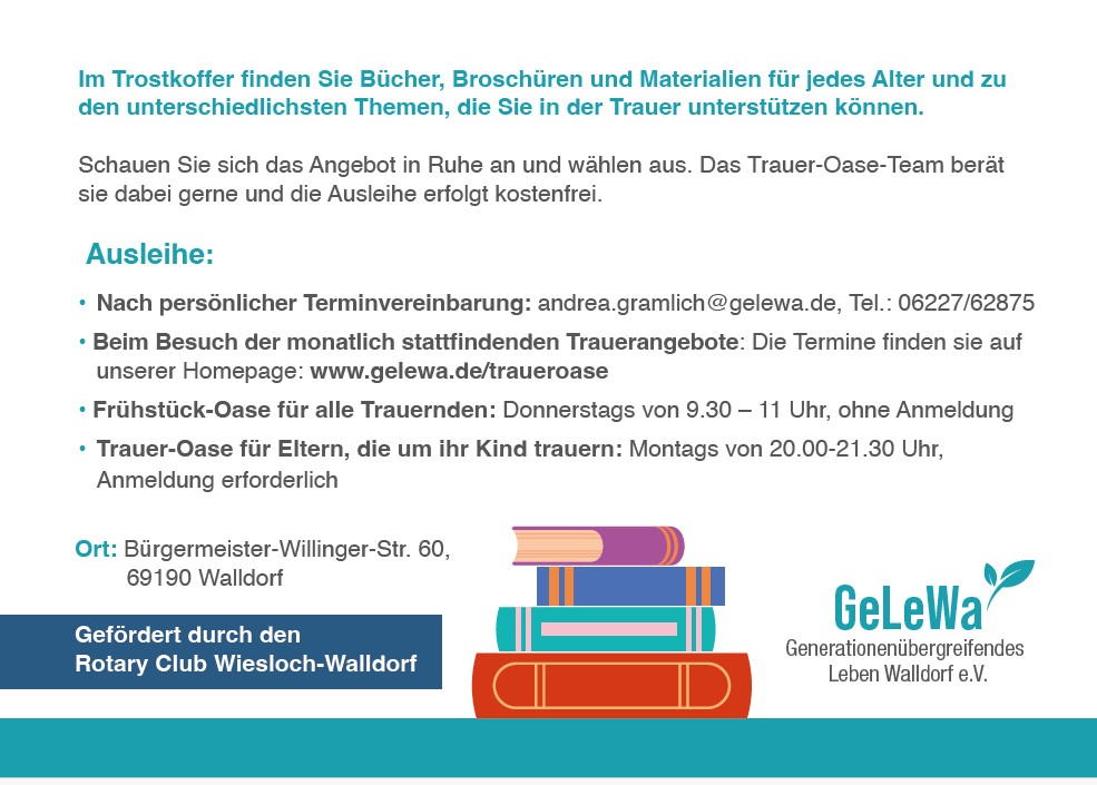 Die zur Verfügung stehende Auswahl an Trauerliteratur kann entweder bei einem der beiden monatlich stattfindenden Angeboten für Trauernde erfolgen oder durch persönliche Terminvereinbarung.
