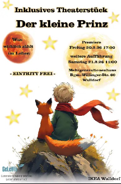 Schon nächste Woche wird die Theaterprojektwoche mit 21 SchauspielerInnen im Alter zwischen 9-65 Jahren im Mehrgenerationenhaus in Walldorf stattfinden. Dieses Jahr wird „Der kleine Prinz“ von Saint-Exupéry die SchauspielerInnen durch die Woche begleiten und in die Welt von Freundschaft und Menschlichkeit hineinführen.