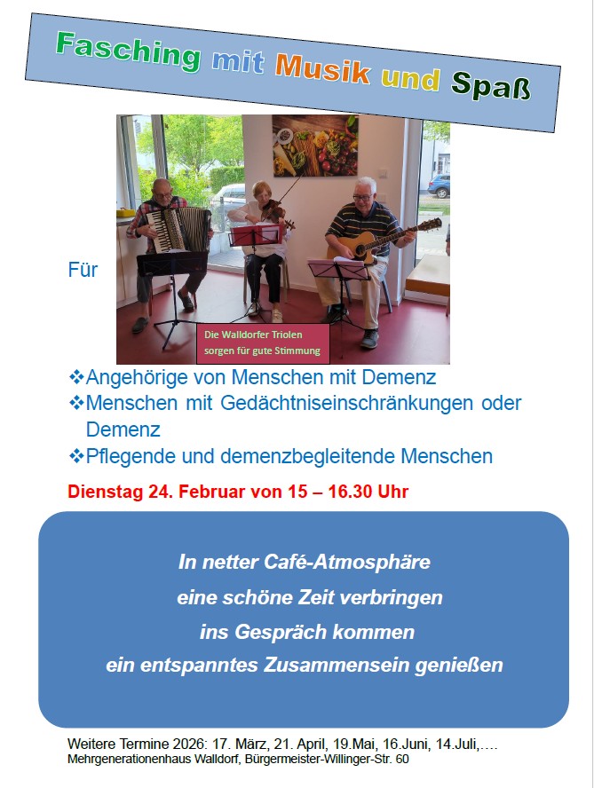 Herzlich laden wir Menschen mit Demenz und ihre Angehörige zu einem fröhlichen Café Nachmittag mit leckerem Kuchen und guter Stimmung ein. Wir werden Fasching feiern – denn die Feste wollen wir feiern wie sie fallen – auch wenn sie laut Kalender eine Woche vorher waren. Da zu Fasching stimmungsvolle Musik gehört, freuen wir uns, dass hierfür das Walldorfer Trio wieder sorgen wird. Wie gewohnt bleibt noch genug Zeit für Gespräch und Austausch und das genießen von Faschingsgebäck und feinem Getränk.